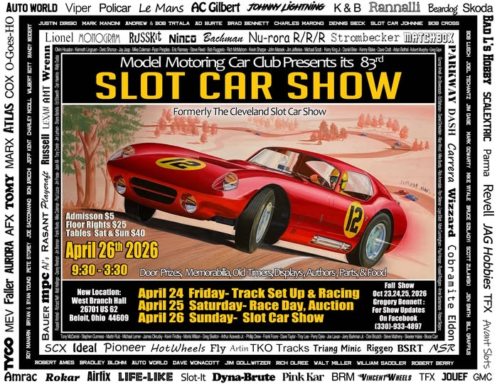 The 83rd Model Motoring Club Slot Car Show (fka The Cleveland Slot Car Show) is only 1 week away! We will have a table at the show where you can choose from over 200 sizes of slot car tires available for purchase – including some 1/24 and 1/43 tires (most 1/32). Do you have a car you can’t find tires for? Bring it with you and we’ll take measurements that day, and can have tires available within a few weeks!